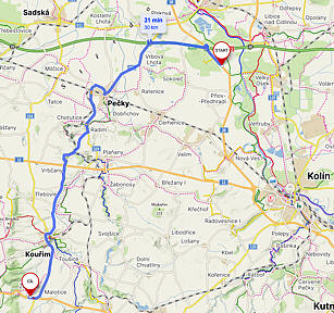 Z čerpací stanice Pap Oil přes přes Kolín směrem na Uhlířské Janovice, odbočíme na Zásmuky a po hlavní dojedme až do Kostelce.